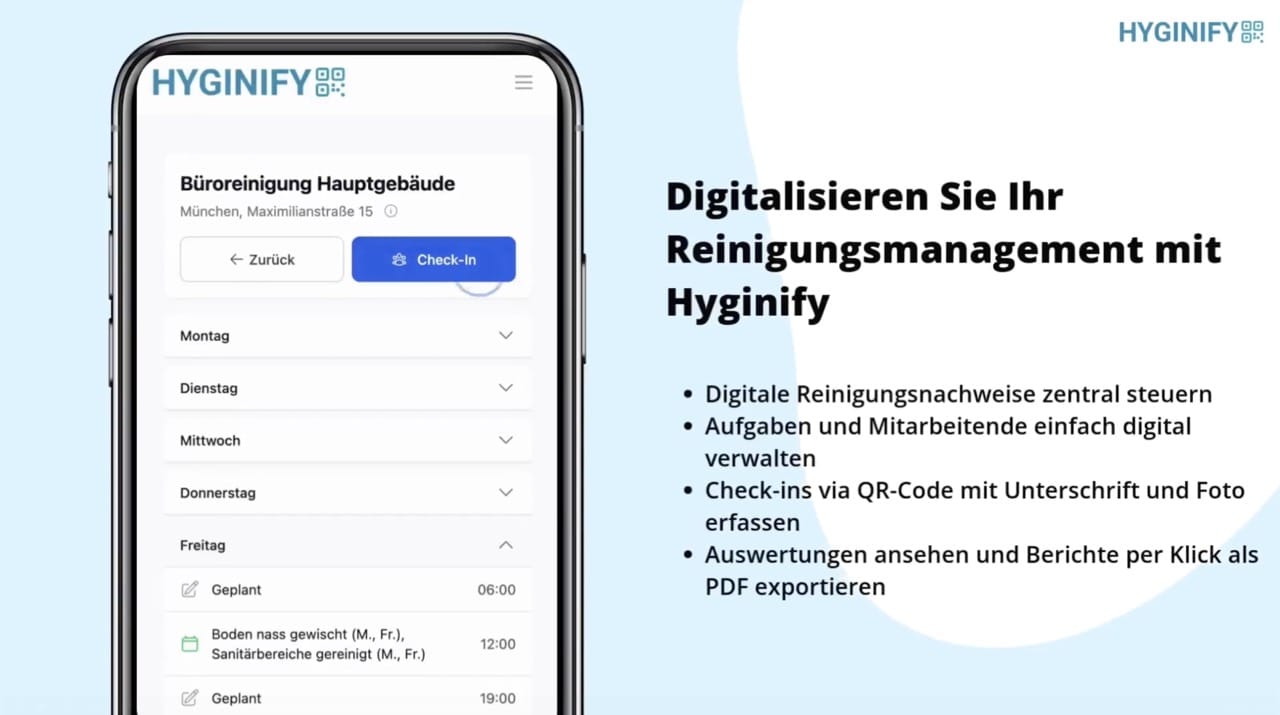 Wer hat wann wo gereinigt? Mit Hyginify wissen Sie es. Ob Hausverwaltung mit 100 Objekten, Fitnesskette mit 30 Studios oder Kommunalbetrieb mit wechselndem Personal: digitale Nachweise, Echtzeit-Auswertungen und volle Kontrolle auf einen Blick.